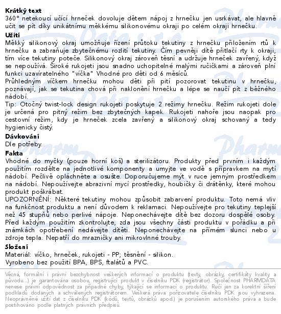 360° netekoucí učící hrneček dovoluje dětem nápoj z hrnečku jen usrkávat, ale hlavně učit se pít díky unikátnímu měkkému silikonovému okraji po celém okraji hrnečku.