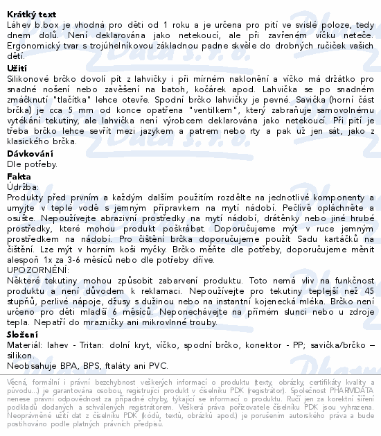 Láhev b.box je vhodná pro děti od 1 roku a je určena pro pití ve svislé poloze, tedy dnem dolů. Není deklarována jako netekoucí, ale při zavřeném víčku neteče. Ergonomický tvar s trojúhelníkovou základnou padne skvěle do drobných ručiček vašich dětí.