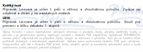 Linovera je zdravotnický prostředek. Účelem tohoto zdravotnického prostředku je péče o citlivou a choulostivou pokožku. Slouží jako prevence dekubitů 1. stupně. Před použitím si prosím pečlivě přečtěte návod k použití, neboť tento obsahuje informace o rizicích spojených s používáním zdravotnického prostředku a další důležité informace.