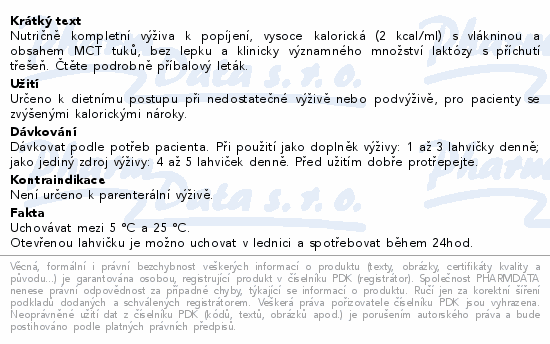 Doporučená denní dávka | Dávkujte podle individuálních nutričních potřeb pacienta. Pro úplnou výživu 4-5 lahviček denně. Pro doplňkovou výživu 1-3 lahvičky denně. Podávejte nejlépe chlazené. Vhodné pro děti starší 4 let.V případě diabetu používejte pouze při pečlivé kontrole metabolismu.