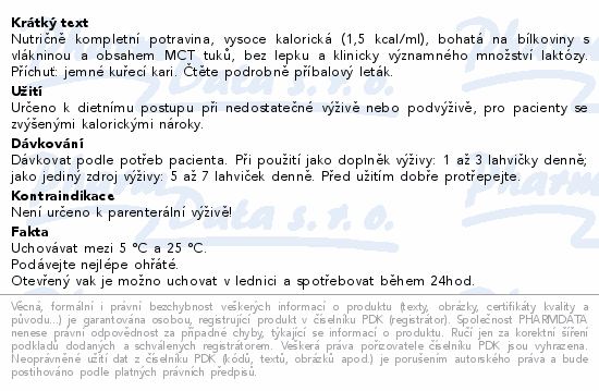 Nutriční hodnoty ve 100 ml: (Průměrný obsah na 100 ml): Energie 150 kcal / 630 kJ, Tuky 5,0 g , (z toho nasycené mastné kyseliny 2,6 g, MCT 2,3 g, mononenasycené mastné kyseliny 0,94 g, polynenasycené mastné kyseliny 0,81 g, omega-3 mastné kyseliny 0,39 g (EPA 0,13 g, DHA 0,08 g), Sacharidy 18,8 g, (z toho cukry 2 g), Vláknina 2,0 g, Bílkoviny 6,0 g, Sůl 0,55 g. Osmolarita 425 mOsm/l. Voda 76 ml/100ml.