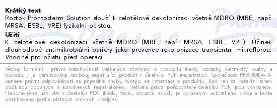 Prontoderm roztok je zdravotnický prostředek, který se používá k mechanické očistě pokožky těla, obličeje a vlasů. Cílem očisty je omezit růst, šíření a přenos multirezistentních mikroorganismů (MDRO) a tím preventivně zabránit infekcím způsobených těmito mikroby. Účinkuje na mikroorganismy typu MRSA/VRE/ESBL, včetně zlatého stafylokoka.