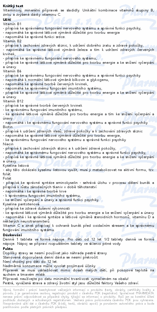Vitamínový, minerální přípravek se sladidly. Unikátní kombinace vitaminů skupiny B, zinku a zvýšené dávky vitaminu C.