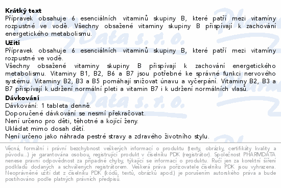 Přípravek obsahuje 6 esenciálních vitaminů skupiny B, které patří mezi vitamíny rozpustné ve vodě. Všechny obsažené vitaminy skupiny B přispívají k zachování energetického metabolismu.