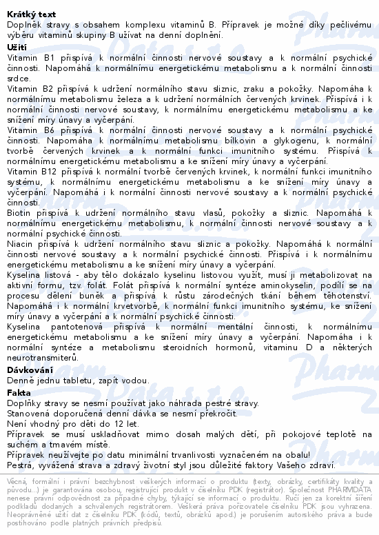 Doplněk stravy s obsahem komplexu vitaminů B. Přípravek je možné díky pečlivému výběru vitaminů skupiny B užívat na denní doplnění.