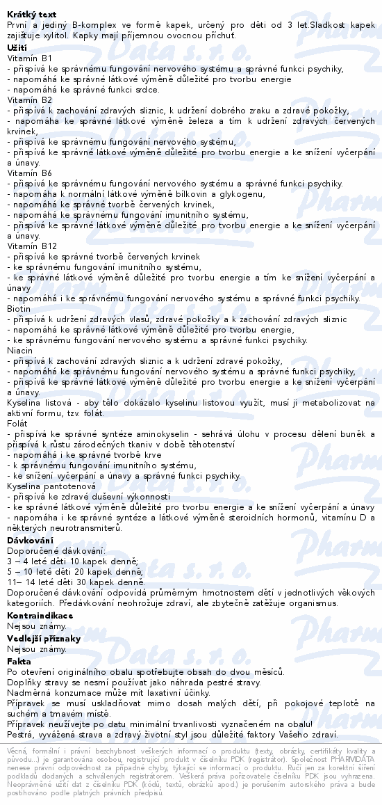 První a jediný B-komplex ve formě kapek, určený pro děti od 3 let.Sladkost kapek zajišťuje xylitol. Kapky mají příjemnou ovocnou příchuť.