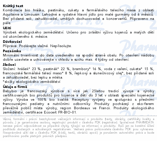 Kombinace bio hrášku, pastináku, cukety a farmářského telecího masa z oblasti Aquitaine a Limousin. Lahodné a vydatné hlavní jídlo pro malé gurmány od 6 měsíců. Bez přidané soli, zahušťovadel, umělých dochucovadel a konzervantů. Připraveno na páře.