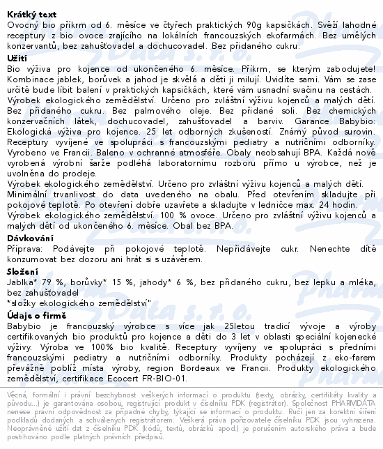 Ovocný bio příkrm od 6. měsíce ve čtyřech praktických 90g kapsičkách. Svěží lahodné receptury z bio ovoce zrajícího na lokálních francouzských ekofarmách. Bez umělých konzervantů, bez zahušťovadel a dochucovadel. Bez přidaného cukru.