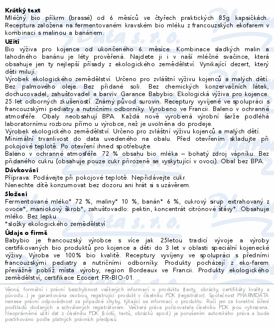 Mléčný bio příkrm (brassé) od 6 měsíců ve čtyřech praktických 85g kapsičkách. Receptura založena na fermentovaném kravském bio mléku z francouzských ekofarem v kombinaci s malinou a banánem.