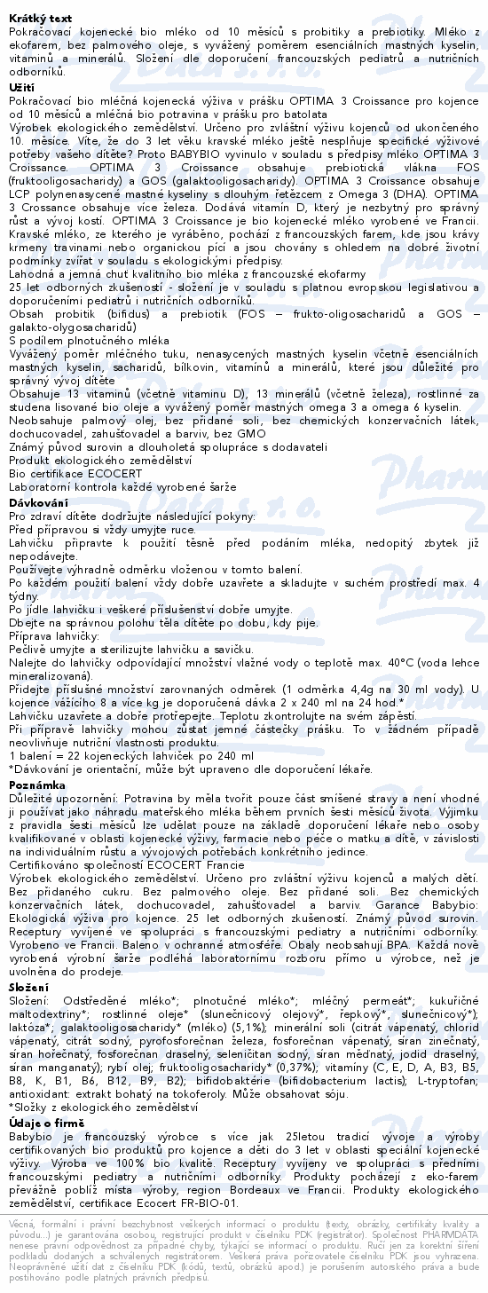 Pokračovací kojenecké bio mléko od 10 měsíců s probitiky a prebiotiky. Mléko z ekofarem, bez palmového oleje, s vyvážený poměrem esenciálních mastných kyselin, vitaminů a minerálů. Složení dle doporučení francouzských pediatrů a nutričních odborníků.