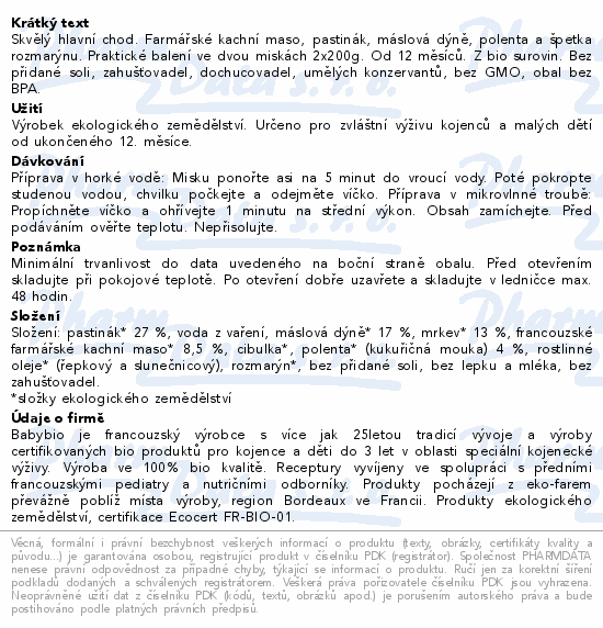 Skvělý hlavní chod. Farmářské kachní maso, pastinák, máslová dýně, polenta a špetka rozmarýnu. Praktické balení ve dvou miskách 2x200g. Od 12 měsíců. Z bio surovin. Bez přidané soli, zahušťovadel, dochucovadel, umělých konzervantů, bez GMO, obal bez BPA.