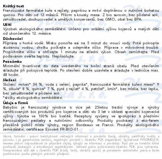 Francouzské farmářské kuře s rajčaty, paprikou a mrkví doplněnou o nutričně bohatou quinou. Pro děti od 12 měsíců. Příkrm s kousky masa. Z bio surovin, bez přidané soli, zahušťovadel, dochucovadel a umělých konzervantů, bez GMO, obal bez BPA.