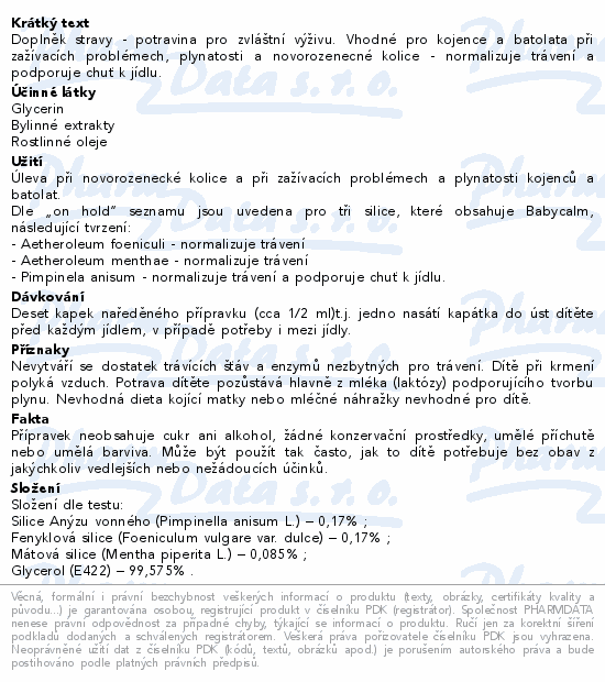 Doplněk stravy - potravina pro zvláštní výživu. Vhodné pro kojence a batolata při zažívacích problémech, plynatosti a novorozenecné kolice - normalizuje trávení a podporuje chuť k jídlu.