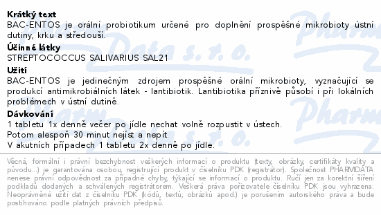 BAC-ENTOS je orální probiotikum určené pro doplnění prospěšné mikrobioty ústní dutiny, krku a středouší.