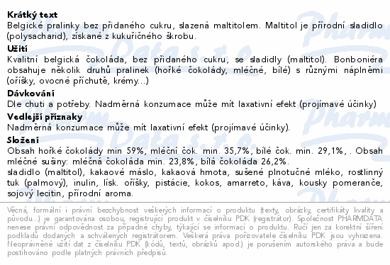 Belgické pralinky bez přidaného cukru, slazená maltitolem. Maltitol je přírodní sladidlo (polysacharid), získané z kukuřičného škrobu.