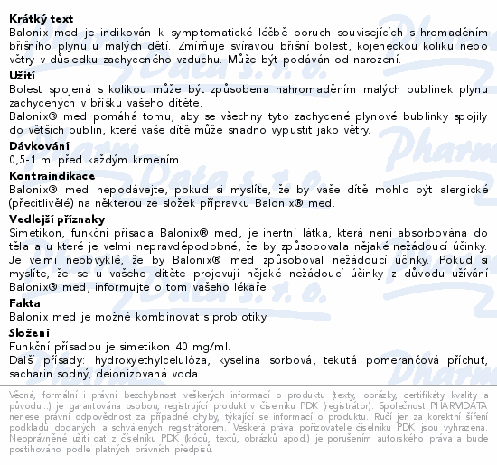 Balonix med je indikován k symptomatické léčbě poruch souvisejících s hromaděním břišního plynu u malých dětí. Zmírňuje svíravou břišní bolest, kojeneckou koliku nebo větry v důsledku zachyceného vzduchu. Může být podáván od narození.