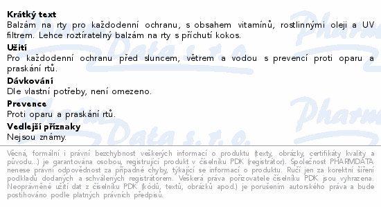 Balzám na rty pro každodenní ochranu, s obsahem vitamínů, rostlinnými oleji a UV filtrem. Lehce roztíratelný balzám na rty s příchutí kokos.