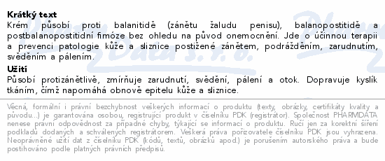 Krém působí proti balanitidě (zánětu žaludu penisu), balanopostitidě a postbalanopostitidní fimóze bez ohledu na původ onemocnění. Jde o účinnou terapii a prevenci patologie kůže a sliznice postižené zánětem, podrážděním, zarudnutím, svěděním a pálením.