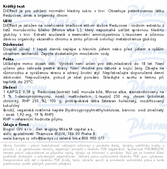 DiEffect je pro udržení normální hladiny cukru v krvi. Obsahuje patentovanou látku Reducose, zinek a organický chrom.