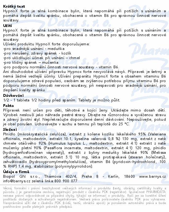 HypnoX forte je bylinný doplněk stravy ve formě tobolek, vyrobený z vysoce jakostních standardizovaných bylinných extraktů. Obsahuje účinné složky kozlík lékařský, chmel otáčivý, mučenky pletní, meduňku lékařskou a vitamín B6.