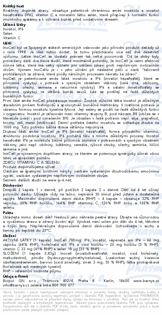 Rostlinný doplněk stravy, obsahuje patentově chráněnou směs inositolu a inositol hexafosfátu (IP6), vitamin C a minerální látku selen, které přispívají k normální funkci imunitního systému a k ochraně buněk před oxidativním stresem.