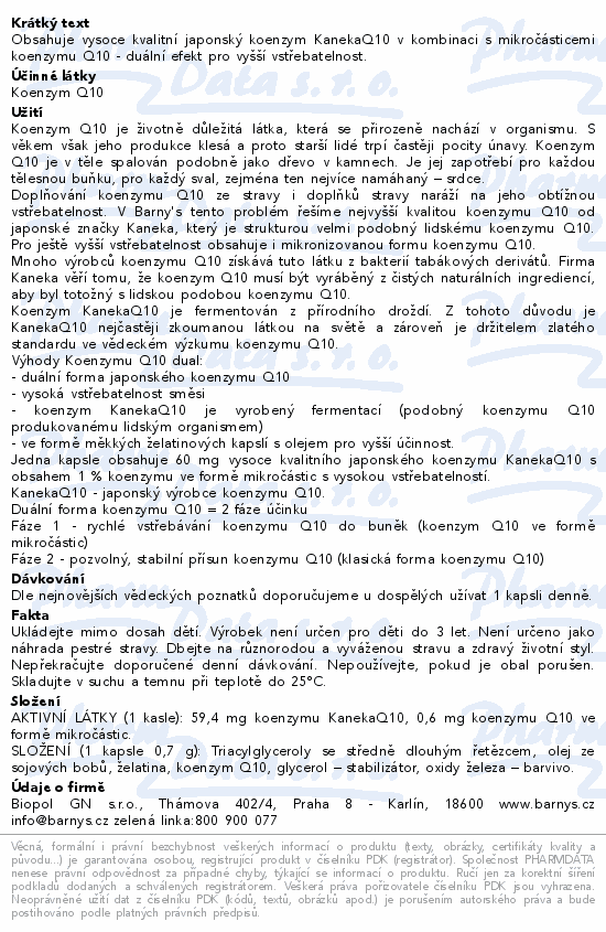 Doplňování koenzymu Q10 ze stravy i doplňků stravy naráží na jeho obtížnou vstřebatelnost. V Barny's tento problém řešen nejvyšší kvalitou koenzymu Q10 od japonské značky Kaneka, který je strukturou velmi podobný lidskému koenzymu Q10. Pro ještě vyšší vstřebatelnost obsahuje i mikronizovanou formu koenzymu Q10.