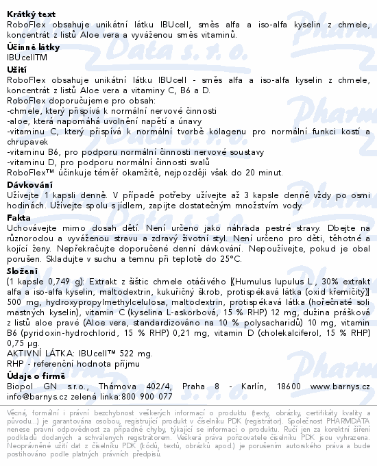 RoboFlex™ obsahuje unikátní látku IBUcell™, směs alfa a iso-alfa kyselin z chmele, koncentrát z listů Aloe vera a vyváženou směs vitaminů.