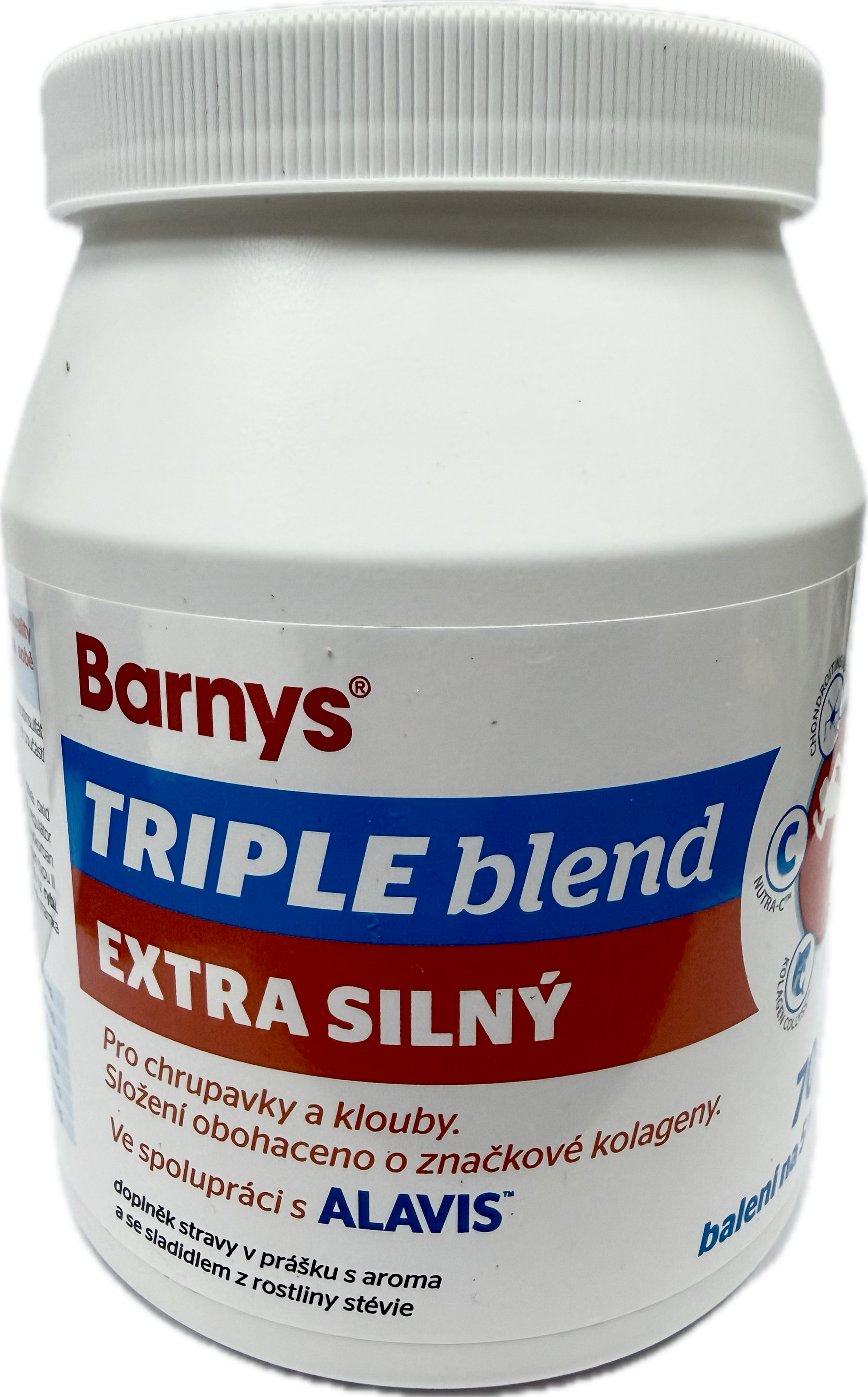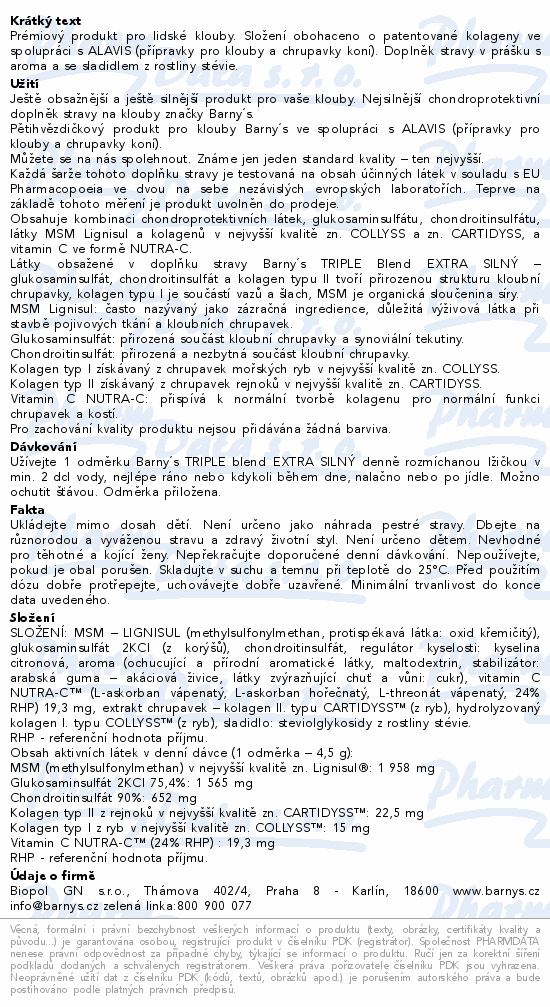 Barnys Triple Blend Extra silný je doplněk stravy v prášku, který obsahuje kombinaci chondroprotektivních látek, glukosaminsulfátu, chondroitinsulfátu, kolagenů (I a II typu) z bezpečného přírodního zdroje, látky MSM Lignisul a vitamín C.