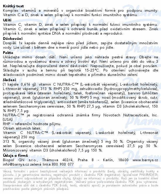 Složení (1 kapsle 0,518 g): vitamin C Nutra-C (L-askorbát vápenatý, L-askorbát hořečnatý, L-threonát vápenatý, 313 % RHP*) 250 mg, zahušťovadlo (hydroxypropylmethylcelulosa), protispékavá látka (stearan hořečnatý, talek, fosforečnan vápenatý), barvivo (uhličitan vápenatý), zinek (glukonan zinečnatý, 50 % RHP*) 5 mg, nosič (modifikovaný škrob, cukr, středněřetězcové triglyceridy), antioxidant (směs tokoferolů), selen (kvasnice obohacené selenem Saccharomyces cerevisiae, 50 % RHP*) 28 mcg, vitamin D3 (cholekalciferol, 150 % RHP*) 7,5 mcg.