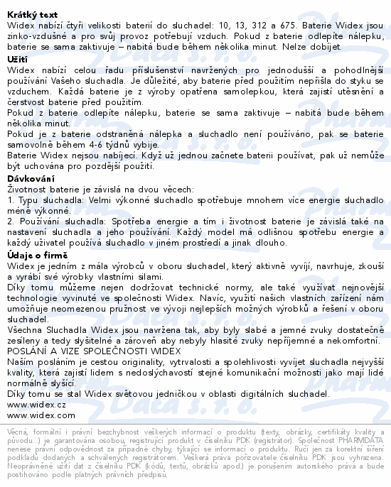 Widex nabízí čtyři velikosti baterií do sluchadel: 10, 13, 312 a 675. Baterie Widex jsou zinko-vzdušné a pro svůj provoz potřebují vzduch. Pokud z baterie odlepíte nálepku, baterie se sama zaktivuje – nabitá bude během několika minut. Nelze dobíjet.