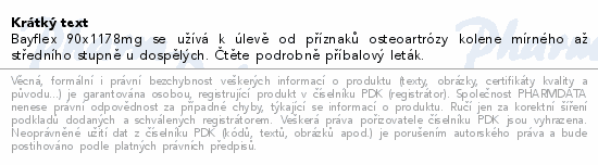 Bayflex 90x1178mg se užívá k úlevě od příznaků osteoartrózy kolene mírného až středního stupně u dospělých. Čtěte pozorně příbalový leták.
