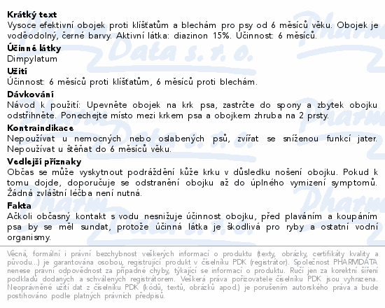 Vysoce efektivní obojek proti klíšťatům a blechám pro psy od 6 měsíců věku. Obojek je voděodolný, černé barvy. Aktivní látka: diazinon 15%. Účinnost: 6 měsíců.