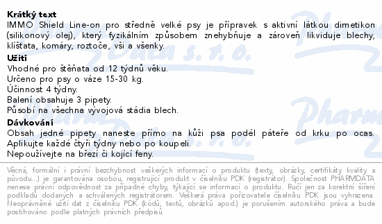 IMMO Shield Line-on pro středně velké psy je přípravek s aktivní látkou dimetikon (silikonový olej), který fyzikálním způsobem znehybňuje a zároveň likviduje blechy, klíšťata, komáry, roztoče, vši a všenky.