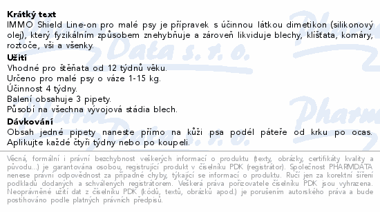 IMMO Shield Line-on pro malé psy je přípravek s účinnou látkou dimetikon (silikonový olej), který fyzikálním způsobem znehybňuje a zároveň likviduje blechy, klíšťata, komáry, roztoče, vši a všenky.