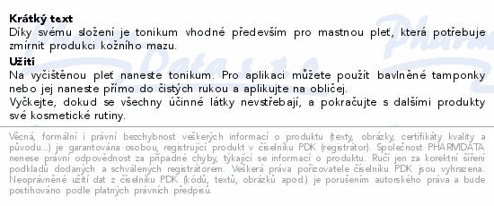 Díky svému složení je tonikum vhodné především pro mastnou pleť, která potřebuje zmírnit produkci kožního mazu.