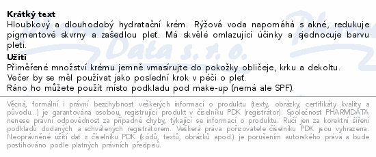 Hloubkový a dlouhodobý hydratační krém. Rýžová voda napomáhá s akné, redukuje pigmentové skvrny a zašedlou pleť. Má skvělé omlazující účinky a sjednocuje barvu pleti.