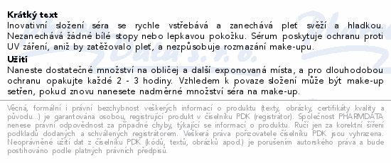 Inovativní složení séra se rychle vstřebává a zanechává pleť svěží a hladkou. Nezanechává žádné bílé stopy nebo lepkavou pokožku. Sérum poskytuje ochranu proti UV záření, aniž by zatěžovalo pleť, a nezpůsobuje rozmazání make-upu.