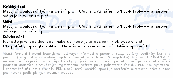 Matující opalovací tyčinka chrání proti UVA a UVB záření SPF50+ PA++++ a zároveň vyživuje a zklidňuje pleť.