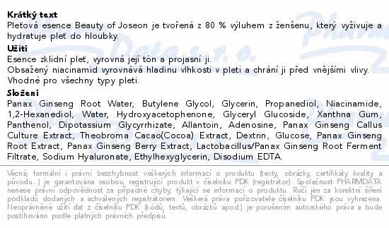 Pleťová esence Beauty of Joseon je tvořená z 80 % výluhem z ženšenu, který vyživuje a hydratuje pleť do hloubky.
