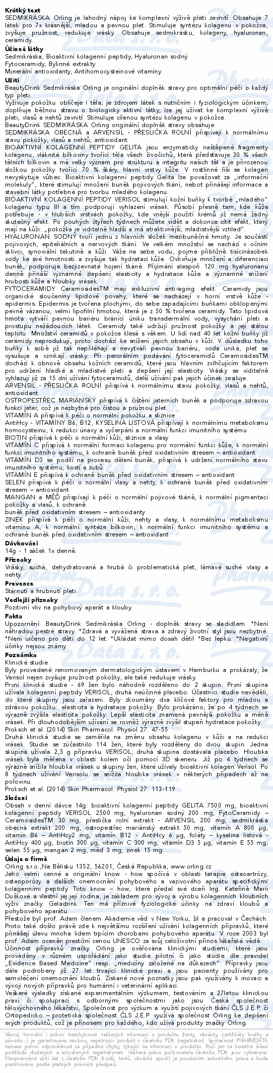 SEDMIKRÁSKA Orling je lahodný nápoj ke komplexní výživě pleti zevnitř. Obsahuje 7 látek pro 7x krásnější, mladou a pevnou pleť. Stimuluje syntézu kolagenu v pokožce, zvyšuje pružnost, redukuje vrásky. Obsahuje sedmikrásku, kolageny, hyaluronan, ceramidy.