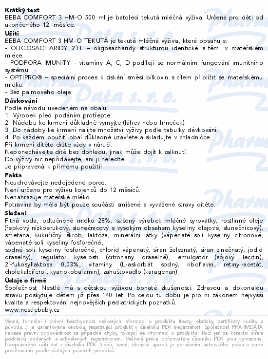 BEBA COMFORT 3 HM-O 500 ml je batolecí tekutá mléčná výživa. Určená pro děti od ukončeného 12. měsíce.