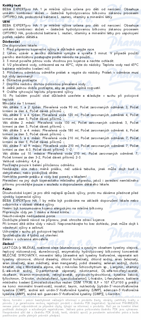 BEBA EXPERTpro HA 1 je mléčná výživa určena pro děti od narození. Obsahuje unikátní kombinaci složek – částečně hydrolyzovanou bílkovinu získanou procesem OPTIPRO HA, probiotické bakterie L. reuteri, vitamíny a minerální látky.