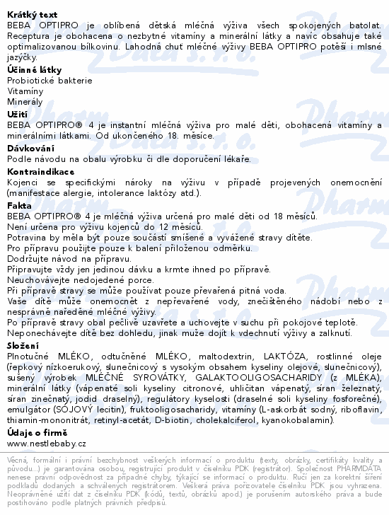 BEBA OPTIPRO je oblíbená dětská mléčná výživa všech spokojených batolat. Receptura je obohacena o nezbytné vitamíny a minerální látky a navíc obsahuje také optimalizovanou bílkovinu. Lahodná chuť mléčné výživy BEBA OPTIPRO potěší i mlsné jazýčky.