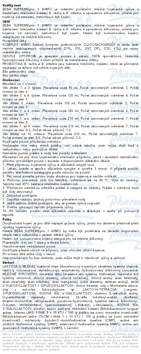 BEBA SUPREMEpro 1 6HMO je instantní počáteční mléčná kojenecká výživa s bakteriemi mléčného kvašení B. lactis a B. infantis a upravenou bílkovinou, určená pro kojence od narození, nemohou-li být kojeni.