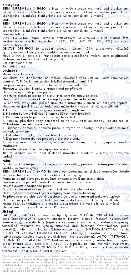 BEBA SUPREMEpro 3 6HMO je instantní mléčná výživa pro malé děti s bakteriemi mléčného kvašení B. lactis a B. infantis a upravenou bílkovinou, určená pro děti od ukončeného 12. měsíce. Není určena pro výživu kojenců do 12 měsíců.
