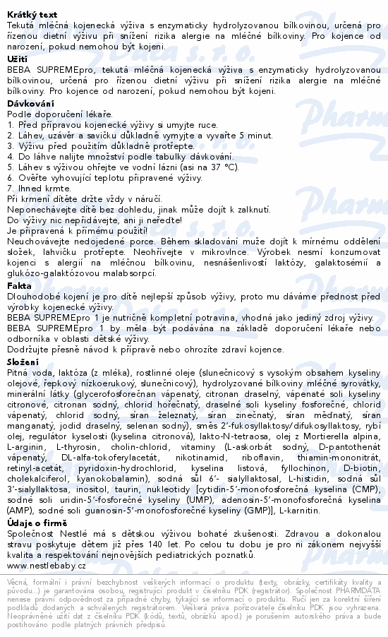 Tekutá mléčná kojenecká výživa s enzymaticky hydrolyzovanou bílkovinou, určená pro řízenou dietní výživu při snížení rizika alergie na mléčné bílkoviny. Pro kojence od narození, pokud nemohou být kojeni.