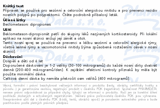 | Farmako-terapeutická skupina, účinné látky: | RESPIRAČNÍ SYSTÉM -> NOSNÍ LÉČIVA -> DEKONGESČNÍ A JINÁ NOSNÍ LÉČIVA K LOKÁLNÍ APLIKACI -> KORTIKOSTEROIDY -> BEKLOMETASON |