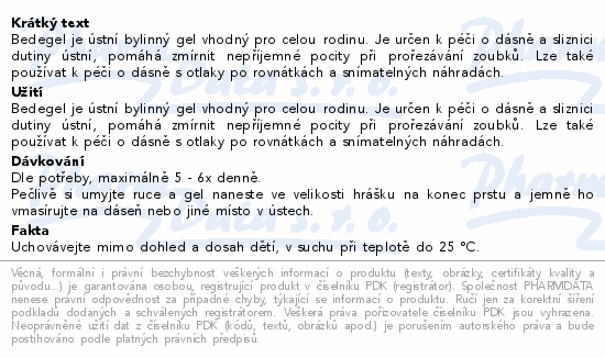 Bedegel je ústní bylinný gel vhodný pro celou rodinu. Je určen k péči o dásně a sliznici dutiny ústní, pomáhá zmírnit nepříjemné pocity při prořezávání zoubků. Lze také používat k péči o dásně s otlaky po rovnátkách a snímatelných náhradách.
