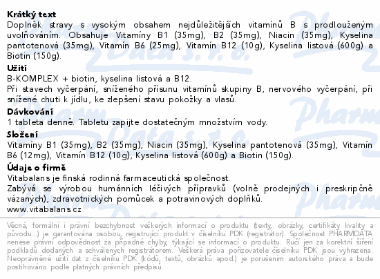 Doplněk stravy s vysokým obsahem nejdůležitějších vitamínů B s prodlouženým uvolňováním. Obsahuje Vitamíny B1 (35mg), B2 (35mg), Niacin (35mg), Kyselina pantotenová (35mg), Vitamín B6 (25mg), Vitamín B12 (10g), Kyselina listová (600g) a Biotin (150g).