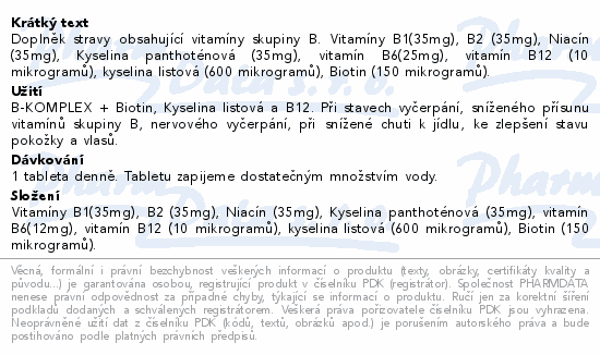 Doplněk stravy obsahující vitamíny skupiny B. Vitamíny B1(35mg), B2 (35mg), Niacín (35mg), Kyselina panthoténová (35mg), vitamín B6(25mg), vitamín B12 (10 mikrogramů), kyselina listová (600 mikrogramů), Biotin (150 mikrogramů).